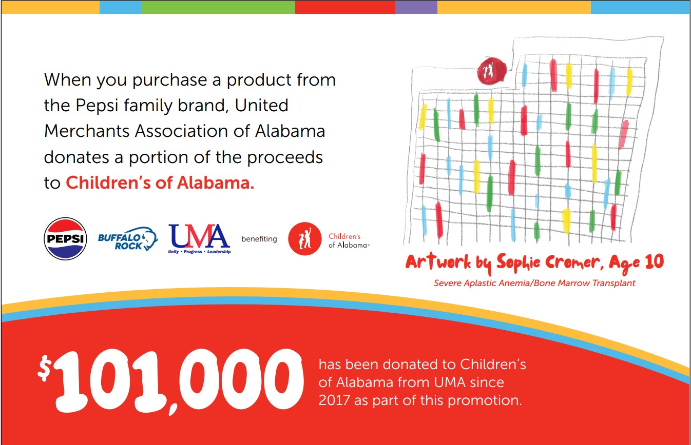 UMA members throughout Alabama collaborate with Buffalo Rock to raise funds for Children’s of Alabama®. With each purchase of a Pepsi product, a portion of the proceeds supports the care of sick and injured children at the state’s only freestanding pediatric hospital in Birmingham. Since 2017, this partnership has generated over $101,000 in support of Children’s of Alabama®. We remain committed to sustaining this initiative to ensure that children receive essential medical care. We extend our gratitude to Buffalo Rock, UMA members across Alabama, and our valued customers. Your generosity enables this important work.